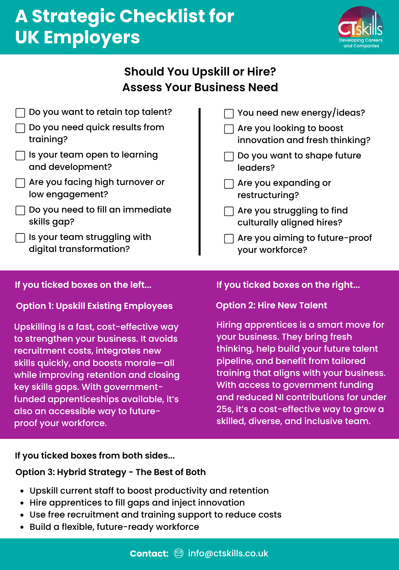 The most effective strategy? Combine both. A hybrid approach—upskilling current staff while hiring apprentices—builds a strategic pipeline solution. As highlighted by the BBC, hiring in the UK is increasingly complex. A balanced strategy helps employers stay agile and competitive and creates a flexible, future-ready workforce.